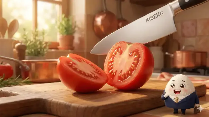 最初に切ったのは、完熟のトマトでした。これまでの包丁なら、少し力を入れて皮を破る必要がありましたが、KISEKI: